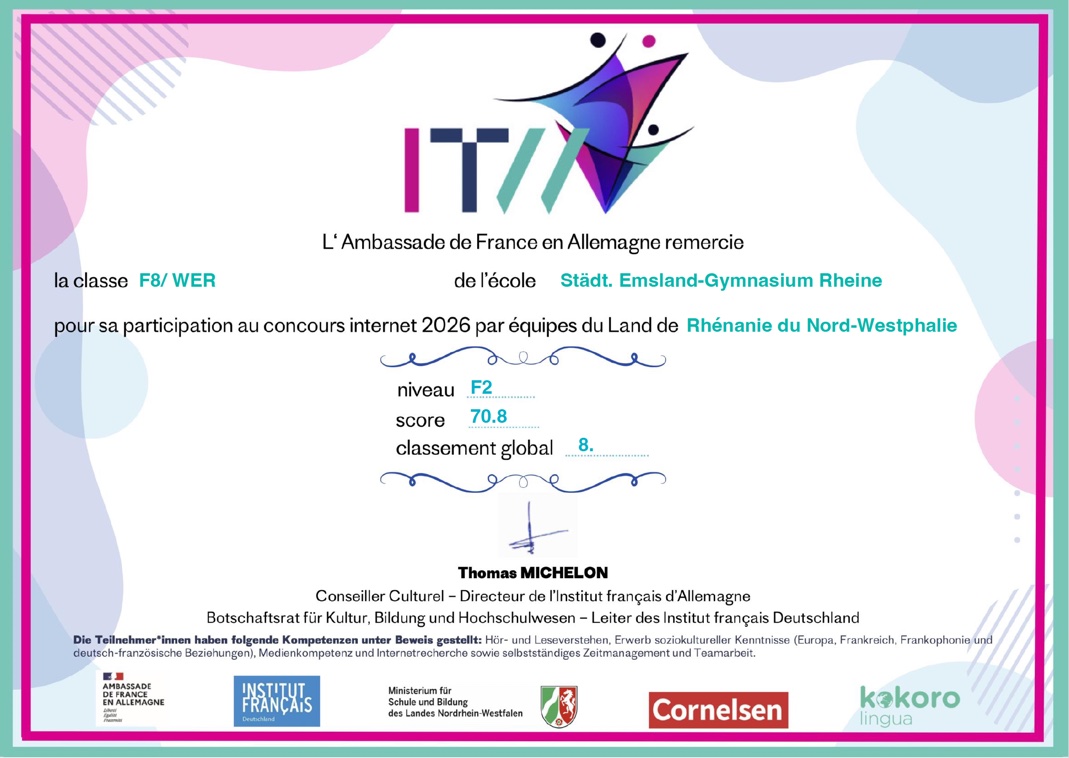 Der Französischkurs F8 des Städtischen Emsland-Gymnasiums Rheine hat beim Internet-Teamwettbewerb 2026 des Institut français einen herausragenden Erfolg erzielt. Mit 70,8 von 80 Punkten erreichte der Kurs im Niveau F2 (A1–A2) den 8. Platz von 887 angemeldeten Klassen in NRW und bundesweit.
